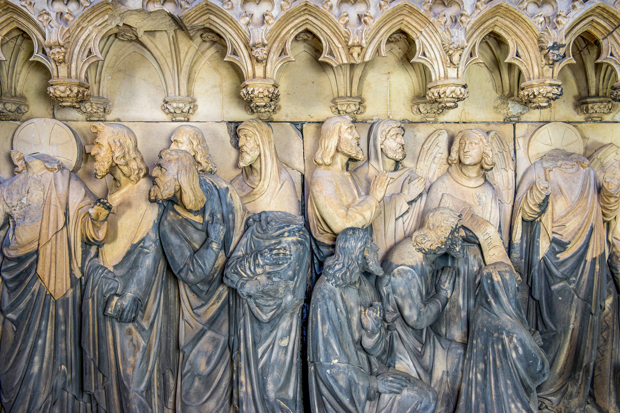 Kölner Dom, Michaelsportal: Reliefplatte aus dem Tympanonfeld mit Darstellung der Aussendung der Apostel und der Himmelfahrt Christi. Die im Partikelfeinstrahlverfahren ausgedünnten Gipskrusten (unten) werden anschließend mit dem Laser abgetragen (oben). © Kölner Dombauhütte, Foto: Mira Unkelbach, 2014.